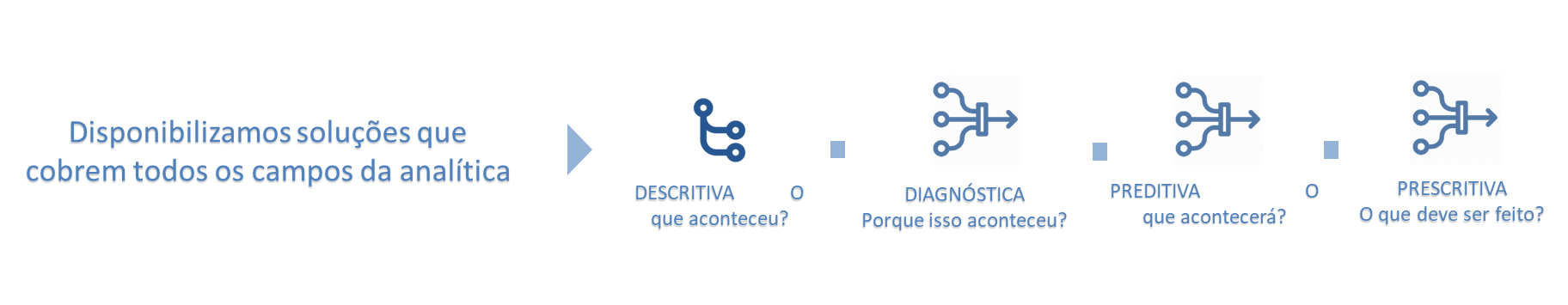 A Nous desenvolve infraestrutura analítica de Big Data Analytics, alimentada por machine learning e outras frentes que integram a abordagem de Inteligência Artificial, com foco em quatro principais tipos de análise: descritiva, diagnóstica, prescritiva e preditiva, visando oferecer soluções para questões como: